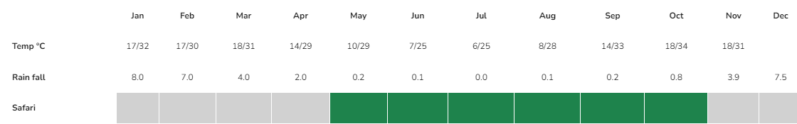 Accommodation is in small lodges, tented camps along the water’s edge with stunning views over the river and the rich wildlife within. Many camps close from early November until April due to the rains